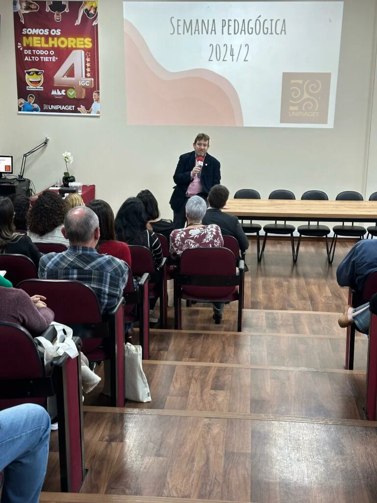 A abertura da reunião foi realizada pelo reitor Prof. Dr. Marcus Rodrigues, que deu as boas-vindas a todos os presentes no retorno das férias e deixou uma mensagem sobre a missão do Unipiaget. “A gente está aqui para formar bons profissionais, para passar conhecimento e para transformar a vida das pessoas. Eu espero que este seja um semestre abençoado para todo mundo”, reforçou.