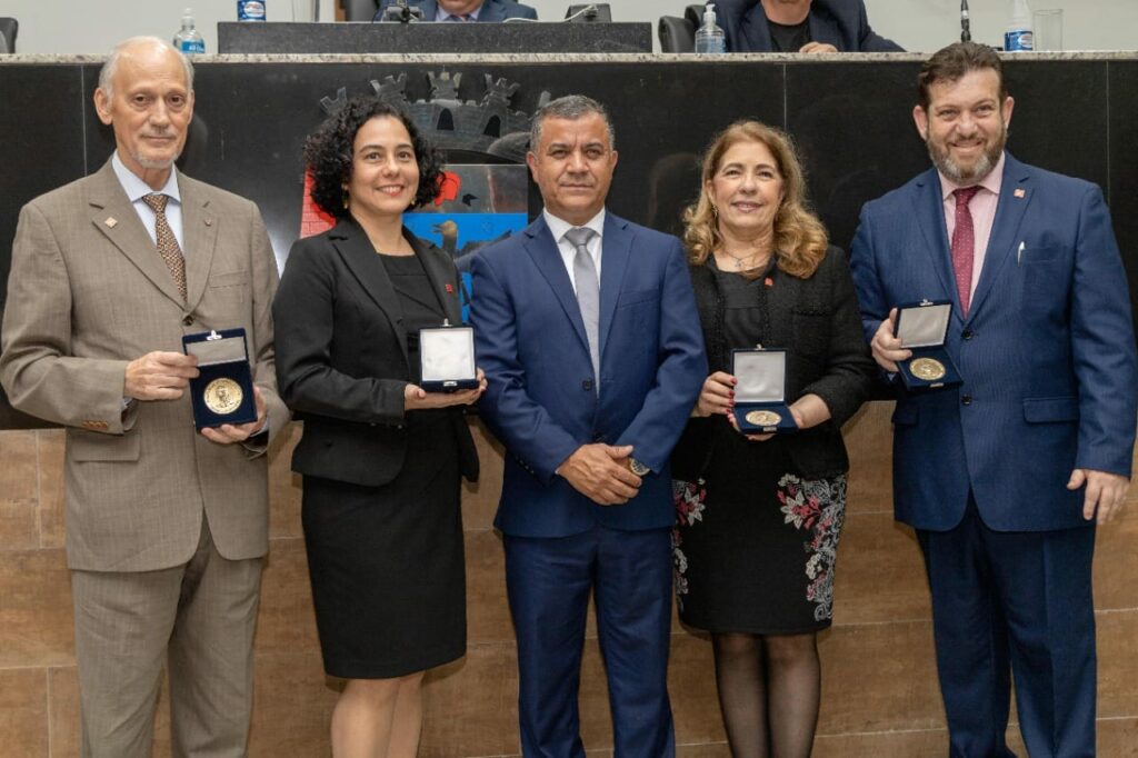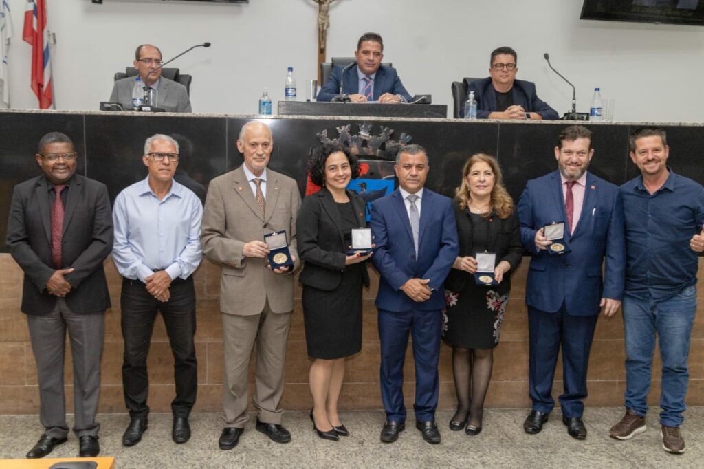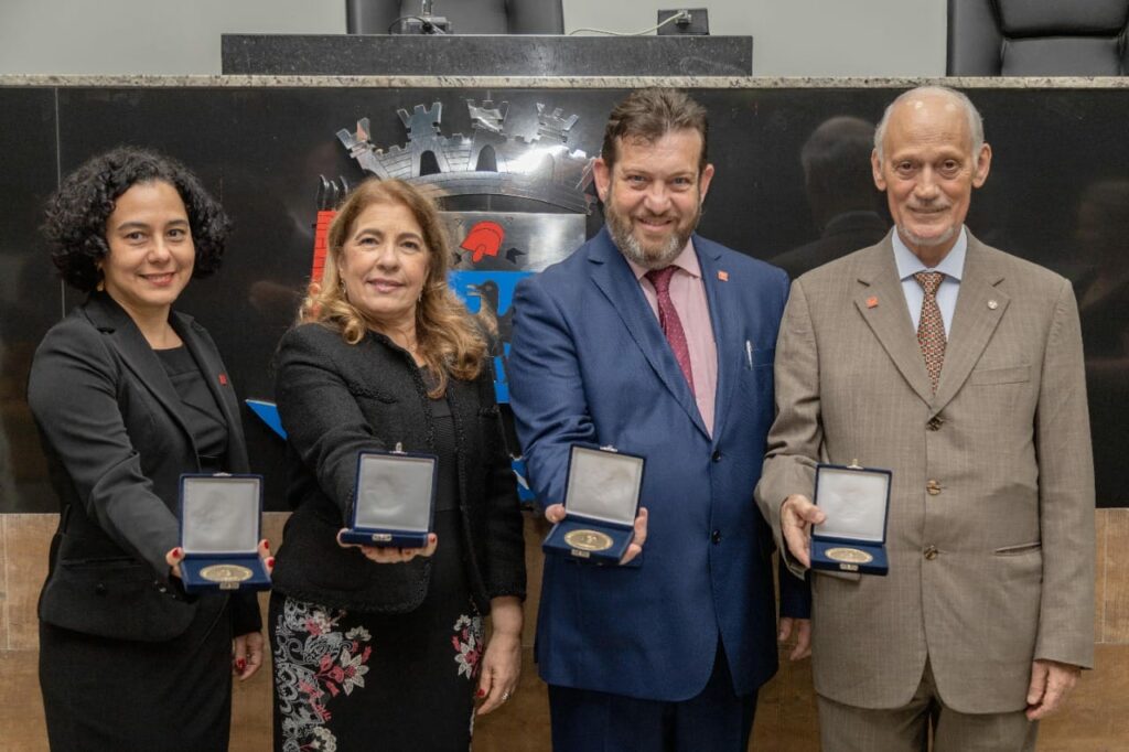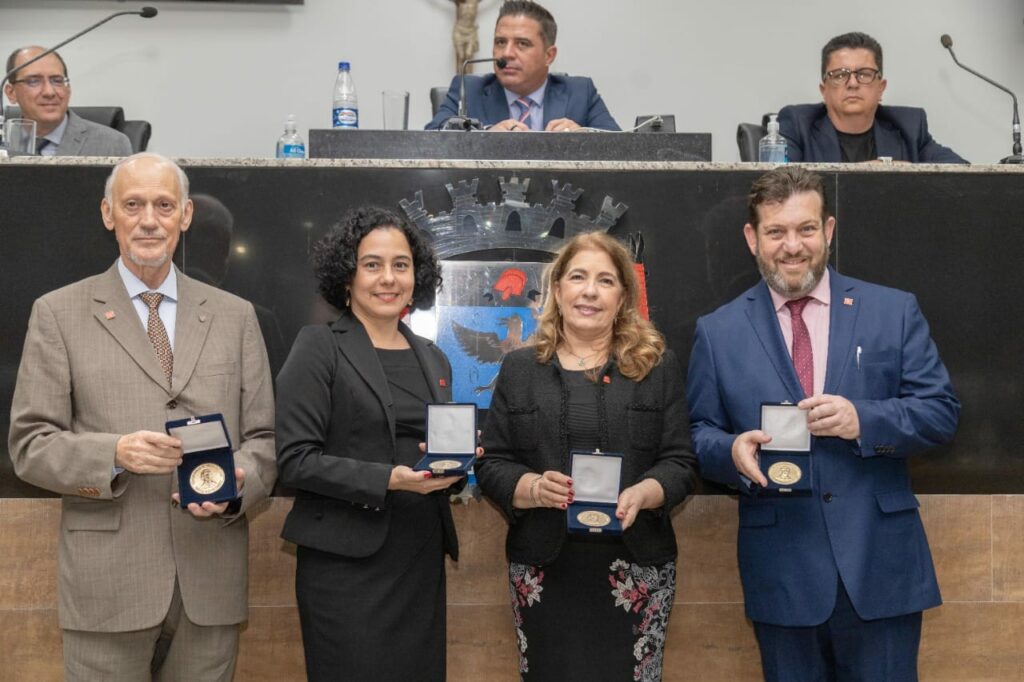 Reitor da instituição, Prof. Dr. Marcus Rodrigues, a pró-reitora acadêmica, professora Poliana Lima, a mantenedora do Unipiaget, doutora Lúcia Marques Pereira, e o idealizador e fundador do Universo Piaget, doutor António Oliveira Cruz, foram homenageados na noite dessa 4ª feira (23/11), na Câmara Municipal de Suzano