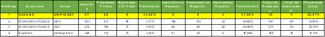 A Faculdade de Direito Unisuz, agora UNISUZANO, ficou na última posição quando avaliada a classificação geral, atrás do Unipiaget, da UMC e da Braz Cubas. Ao todo dos 144 inscritos na 1ª fase, 133 realizaram a prova e apenas 10 (7,52%) foram aprovados na 2ª fase. Já no percentual geral incluindo alunos inscritos no reaproveitamento, ou seja, reprovados anteriormente na 2ª fase, dos 188 presentes apenas 19 (10,11%) foram aprovados, conforme mostrado na tabela abaixo: