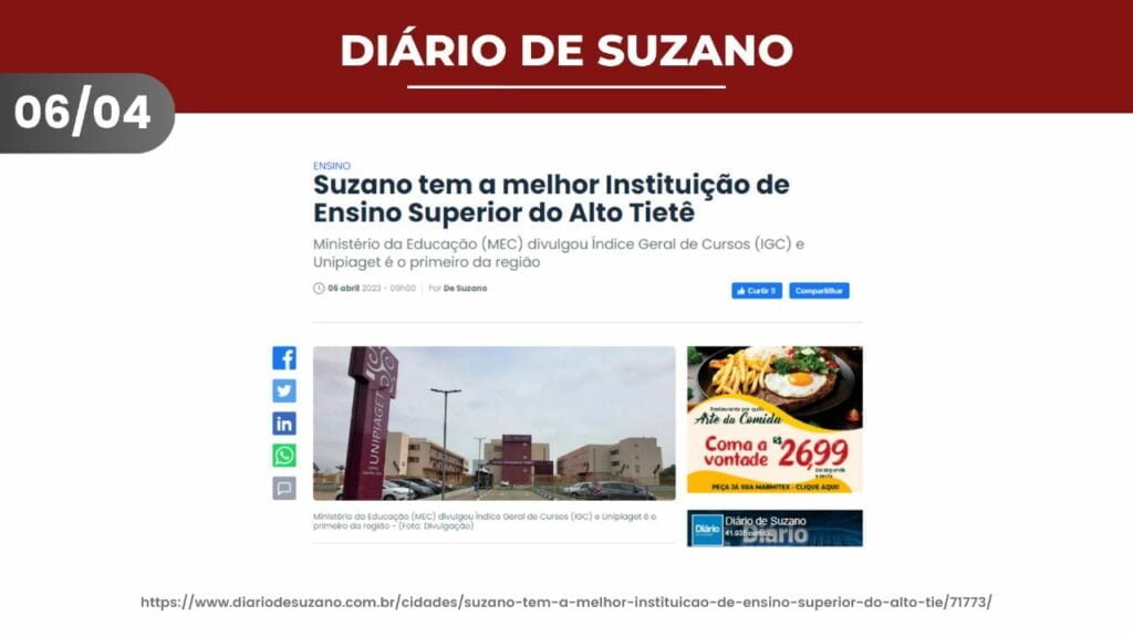 Além destes periódicos, os portais A Semana, Diário de Suzano, Portal News, Suzano TV e Portal Rede Alto Tietê TV também deram a notícia com destaque em suas páginas na internet. Isso mostra a credibilidade do Unipiaget diante dos veículos de imprensa da região.