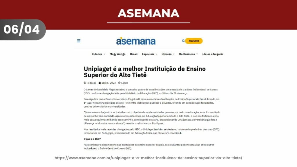 Os jornais impressos diários Mogi News/DAT e Diário de Suzano estamparam em suas capas de 06 de abril a matéria confirmando o Unipiaget com melhor instituição de ensino do Alto Tietê, informação confirmada pelo Ministério da Educação.