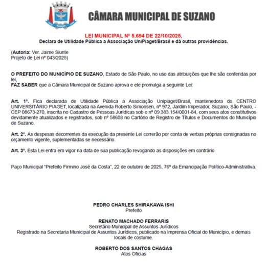 A Câmara Municipal de Suzano aprovou o Projeto de Lei nº 0043/2025, que declara a Associação Unipiaget/Brasil, mantenedora do Centro Universitário Piaget, como entidade de utilidade pública municipal. A proposta, de autoria do vereador Jaime Siunte, reconhece o impacto das ações desenvolvidas pela instituição no município e sua contribuição contínua ao bem-estar coletivo, por meio da LEI MUNICIPAL Nº 5.694 DE 22/10/2025.